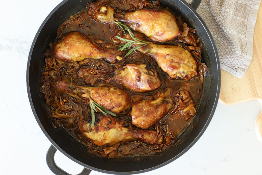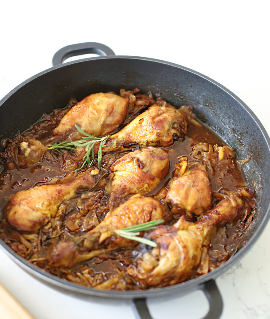 בקצר וקולע – על הכיריים מחממים סוטאז (שיכול להיכנס גם לתנור) עם 2 כפות שמן זית והתבלינים של השלב הראשון, מוסיפים את הבצל והכרוב, אש גבוהה – מטגנים כ-5-10 דק' וכל כמה דקות מערבבים | מפנים מקום לעוף מוסיפים עוד כף שמן זית, וצורבים את העוף משני הצדדים עוד כ-5 דק'| במקביל מחממים תנור על 180-190 מעלות | מערבבים בספל מים רותחים את כל התבלינים של הרוטב ושופכים פנימה | מסדרים חזרה את הכרוב והבצל בין חתיכות העוף, מניחים את ענפי הרוזמרין/טימין ומביאים לרתיחה | מורידים מהאש, מכסים ומעבירים לתנור לכשעה וחצי על 180-190 מעלות | מסירים את הכיסוי, מעלים ל-220 מעלות לעוד כ-20 דקות או עד להשחמה הרצויה | מגישים בסטייל (מעל אורז לבן) – ככה פשוט!