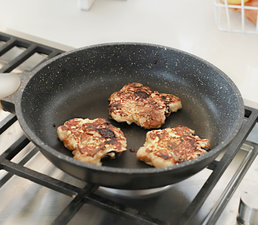3. מחממים מחבת עם מעט שמן רגיל/קוקוס (או שאפשר חמאה במקום למי שאוהב – רק אז להוריד קצת את הלהבה שהיא לא תישרף)