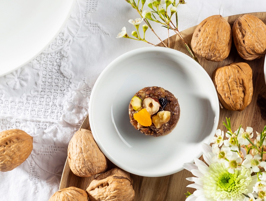 3. מוציאים את תבנית השקעים מהמקפיא ומסדרים את תערובת החרוסת בשקעים מעל שכבת האגוזים. דוחסים ומיישרים עם לקקן