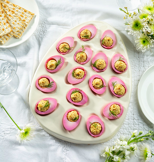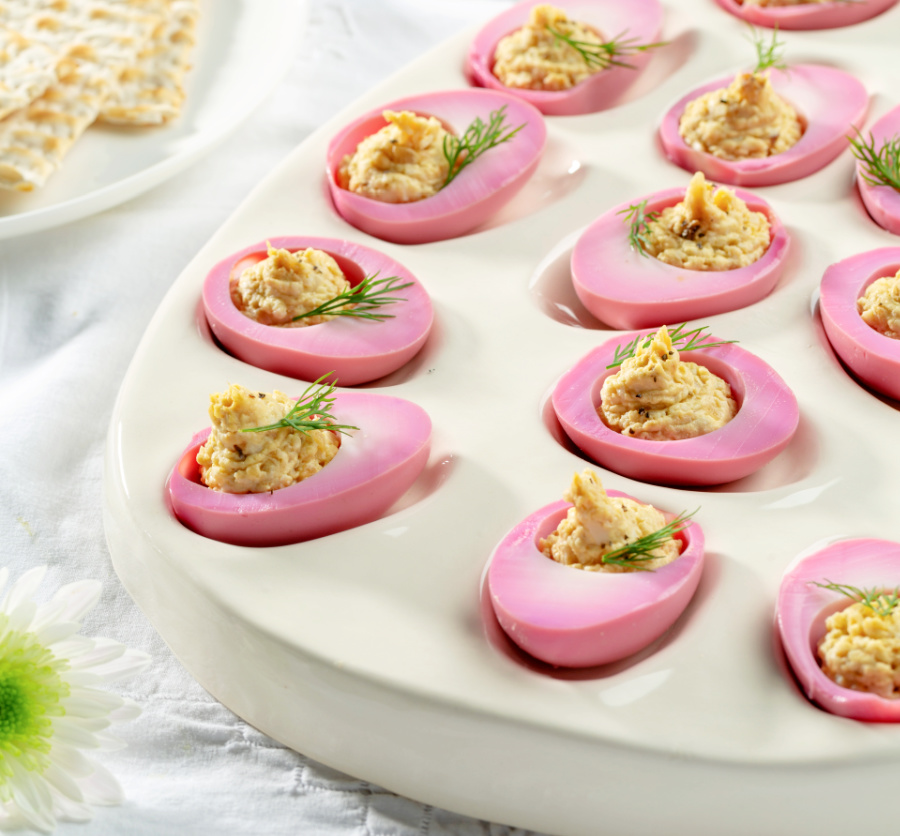 1.הכנת הביצים הוורודות – טוחנים בקופסה/צנצנת גבוהה את הסלק יחד עם המים, והחומץ (במעבד מזון/טוחן ידני) מכניסים לתוכה 9 ביצים קשות מקולפות, סוגרים ומכניסים ללילה במקרר. למחרת ממוציאים, סופגים לייבוש, וחוצים ל-2.