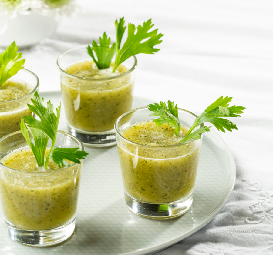 2. מוזגים לכוסיות "שוט" מקשטים כל כוס בענף סלרי קטן ומגישים בסטייל – ככה פשוט!