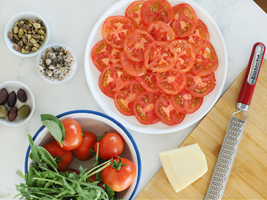 בקצר וקולע – על צלחת לבנה שטוחה מסדרים את פרוסות העגבניה | סוחטים מעליהם מעט לימון ומזלפים שמן זית ומעט מלח ופלפל | מגרדים מעל שכבת פרמז'ן יפה | מפזרים את הירוקם הקצוצים (בעיקר באמצע, ומשאירים שוליים של עגבניות נקיות, שיהיה יפה) | מפזרים בחופשיות את הזיתים החתוכים, הצלפים והפיסטוקים הקצוצים, מוסיפים גרידת לימון | אפשר לזלף עוד קצת שמן זית ולתבל בעוד קצת מלח & פלפל | קולים כמה פרוסות לחם ליד ו-מגישים בסטייל – ככה פשוט!