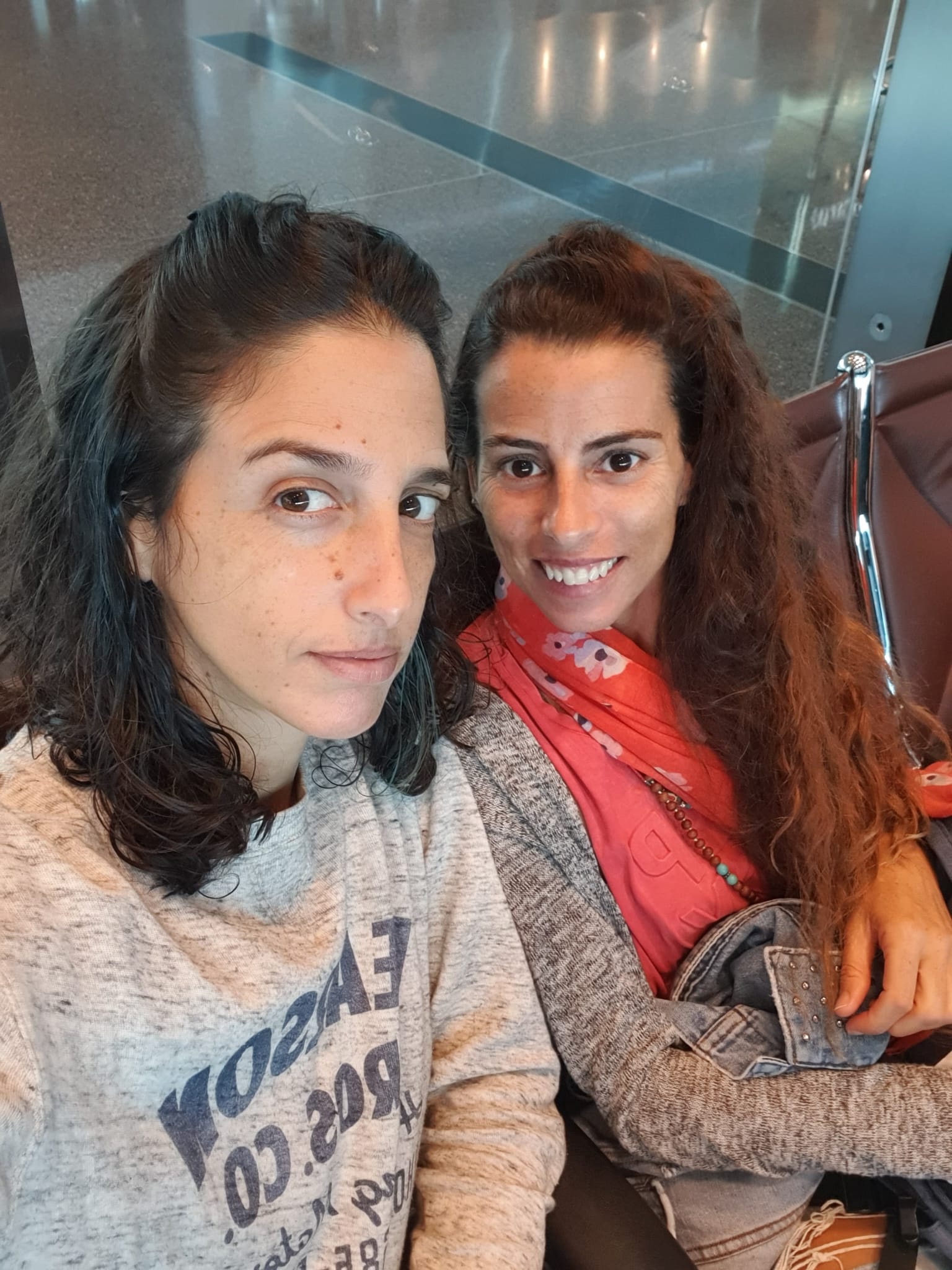 בתמונה, עומר ואני, בשדה התעופה בקטאר, נובמבר 2019, בדרך להודו, מדברות על דפי סיגר