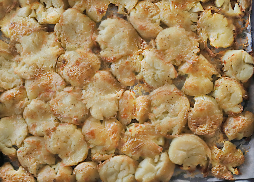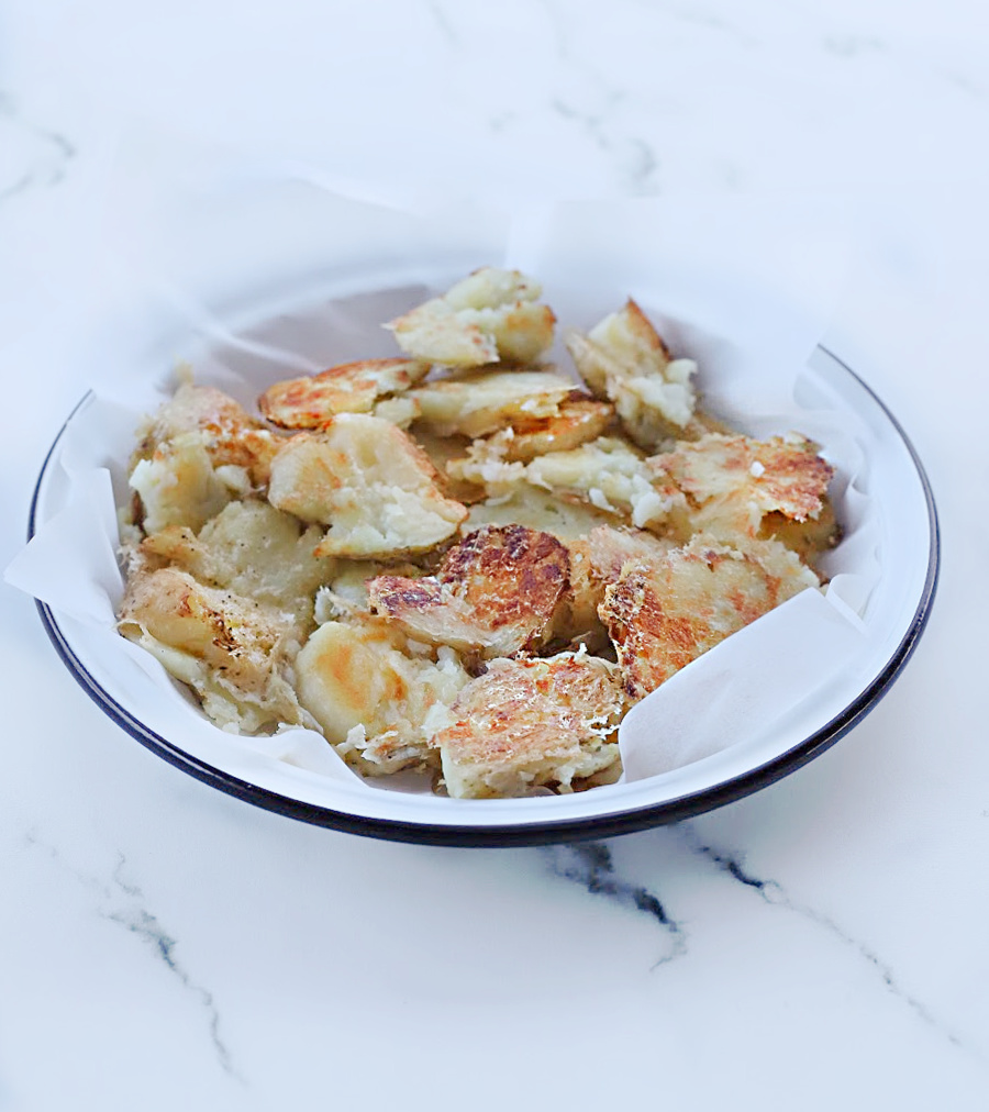 בקצר וקולע – מבשלים את תפוחי האדמה בסיר עם מי ברז יחד עם המלח והסודה עד לריכוך מלא. מסננים | מחממים תנור על 240 מעלות, מרפדים תבנית תנור בנייר אפיה, מברישים אותה בשמן זית ומפזרים מלח גרוס ופרמז'ן | חותכים את תפוחי האדמה לפרוסות עבות מאוד (שומרים גם "נשיקות") ומניחים עם הפנים כלפי מטה על התבנית | פותחים מלמעלה נייר אפיה ומועכים | מוסיפים שמן זית, מלח גס ופרמז'ן בנדיבות | אופים כ-40 דקות או יותר עד להשחמה יפה | מגישים בסטייל – ככה פשוט!