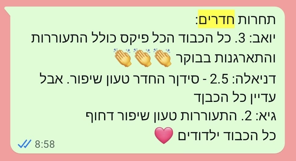 –ושלישית (ואולי הכי חשוב בעיני!) – זה מטמיע בהם הרגל חיובי. אם הם ימשיכו לעשות את זה כל יום, הם פשוט ימשיכו, באוטומט, מבלי שיש תחרות חדרים ואז יוכלו להסיק מזה לתחומים אחרים בחיים…